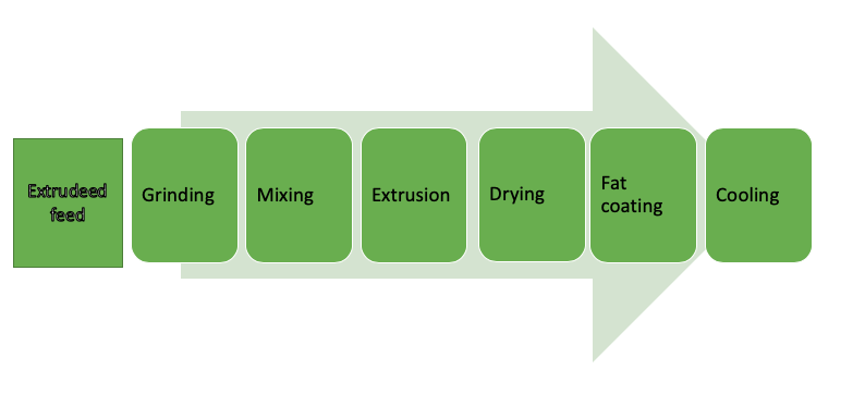 In the above diagram, you can see the main steps in the manufacturing process of extruded feed, and below we’ll describe the main equipment involved in the process and its importance.