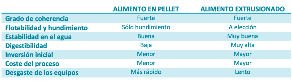 Hoy en día, las dos tecnologías más extendidas para la fabricación de alimentos para acuicultura son la pelletización y la extrusión. El alimento producido con estos procesos presenta mayor densidad, menor grado de humedad y permiten una mejor conservación. Una de las principales diferencias entre el alimento pelletizado y extrusionado es que, mientras que el pellet se hunde, con el alimento extrusionado podemos controlar la flotabilidad incidiendo en el proceso de fabricación. No obstante, la extrusión presenta otras ventajas que veremos a continuación.